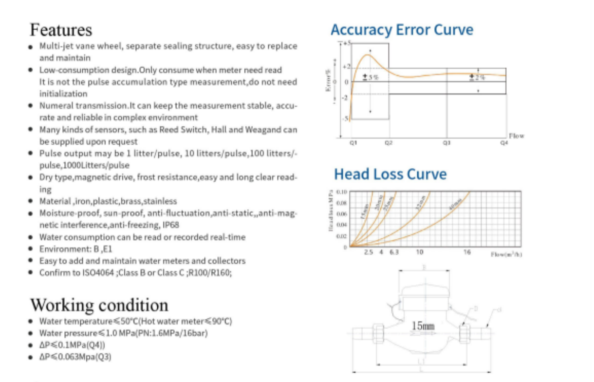 ● Multi-jet vane wheel,separate sealing structure,easy to replace and maintain ·Low-consumption design.Only consume when meter need read It is not the pulse accumulation type measurement,do not need initialization